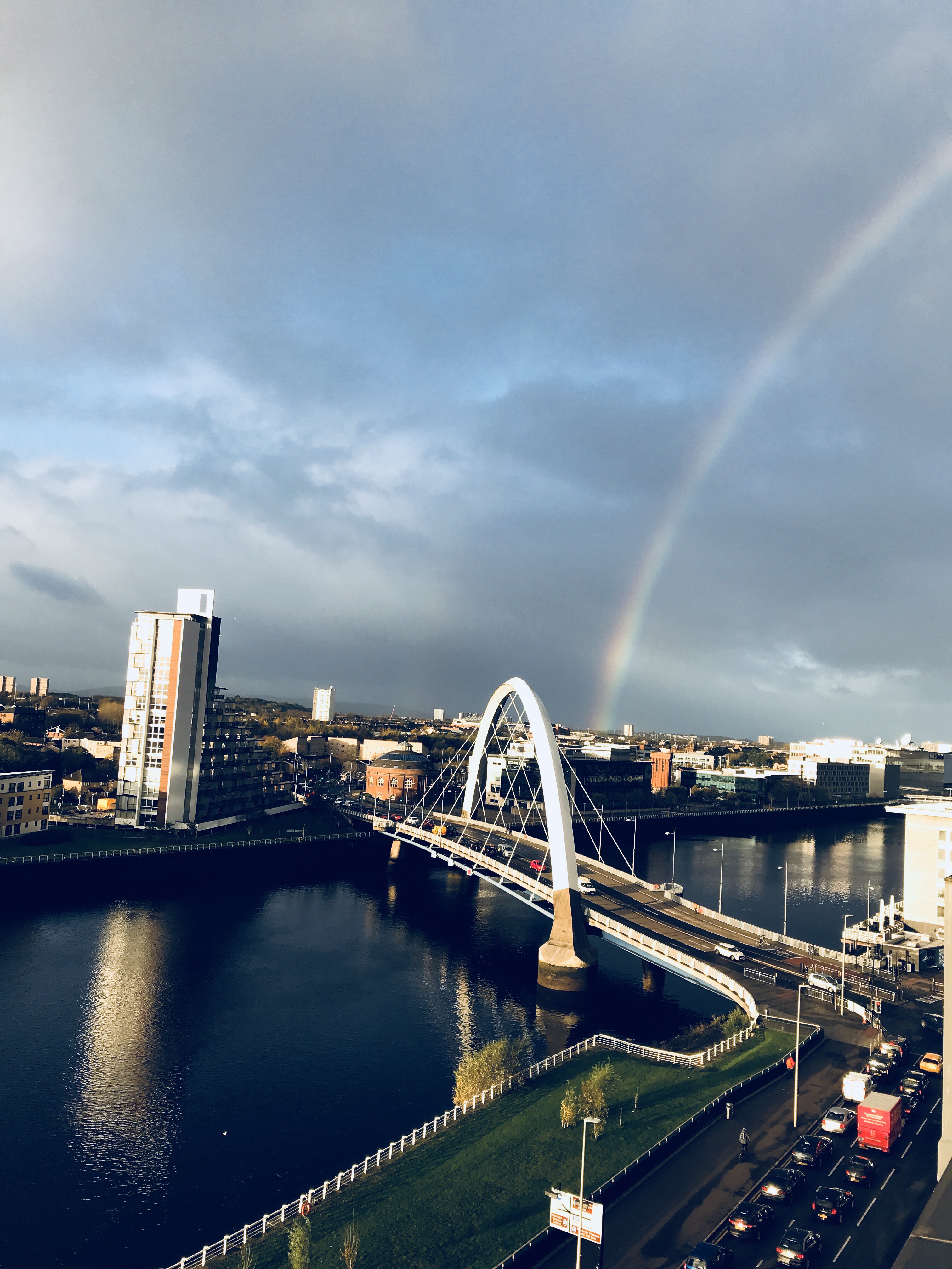 I awoke to a rainbow this morning. After making a cup of coffee I stepped out onto the balcony and looked over at “the squinty” bridge in Glasgow, Scotland. And there it was, a rainbow! A “promise remembered”! A great start to a new day, one that was mixed with exhilaration and small disappointments.