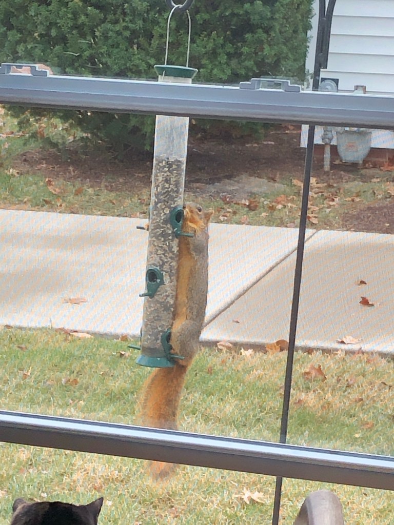 We also have squirrels visit the feeder at the end of they day. They are largely scavengers, cleaningup “ the left-overs.”. I don’t mind. All of God’s creatures have gotta eat.